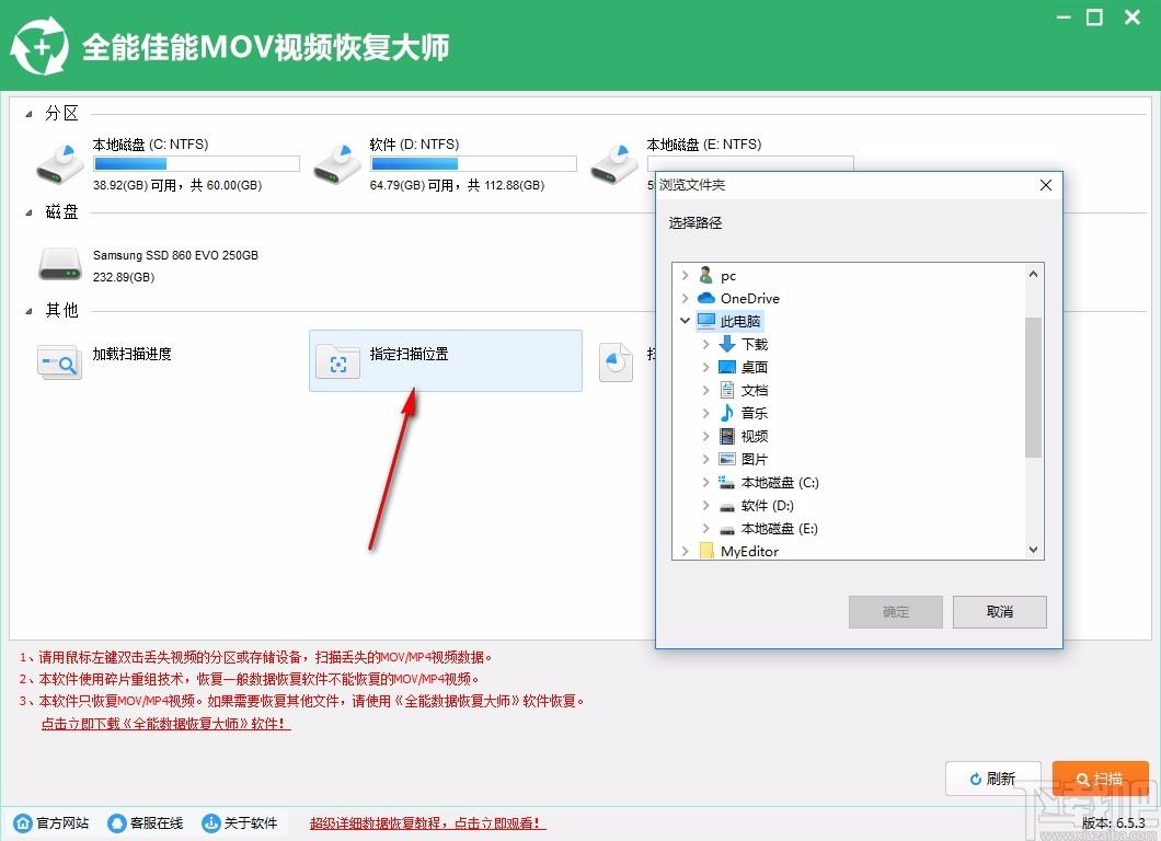 11、点击指定扫描位置,浏览文件夹,选择一个文件夹,然后点击确定即可